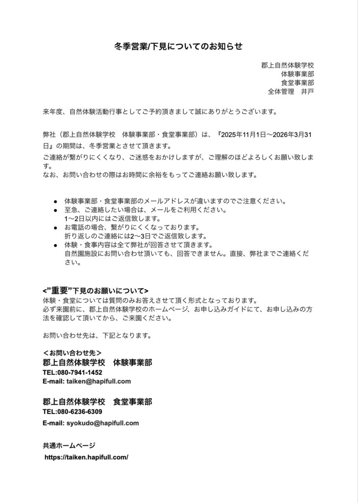 弊社(郡上自然体験学校 体験事業部・食堂事業部)は、『11/1〜3/31』の期間は、冬季営業とさせて頂きます。